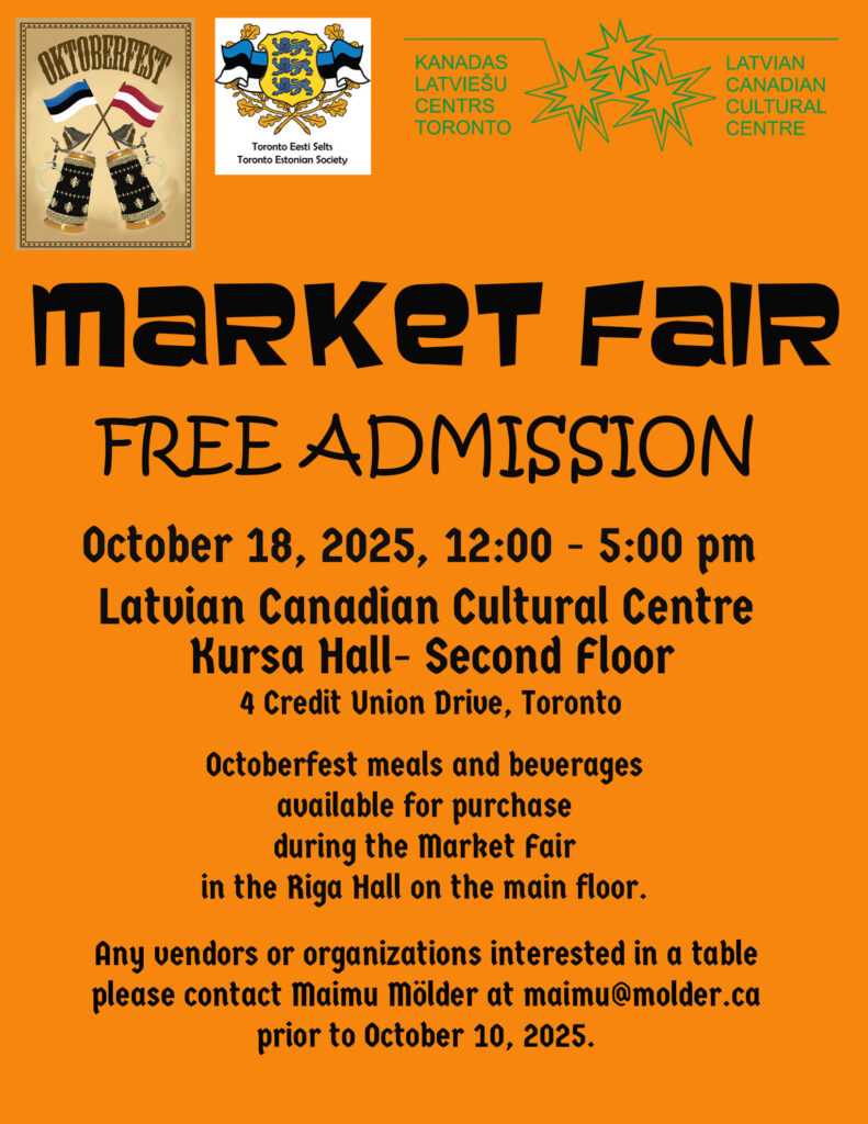 Beginning on Saturday, October 18th, we will have a market fair open to the public (free admission) in the Kursa hall running from 12 noon till 5:00 pm to enjoy Latvian and Estonian merchandise from both community vendors and organizations. The kitchen in the main hall will also be open to sell food to the public. Please contact Maimu Mölder at maimu@molder.ca to reserve your 6-foot table ASAP. Cost per vendor table is $40.00.