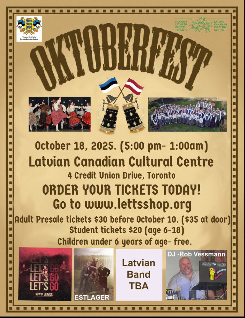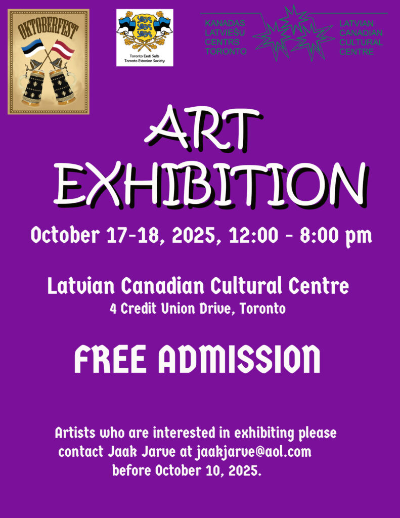 Based on early bird ticket sales, we noticed that most people prefer the Saturday night event. Accordingly, we have revised the Oktoberfest event to a one-day affair to be held on Saturday, October 18th at the Latvian Canadian Cultural Centre. The art exhibition and sale will remain as a two-day event with free admission starting on Friday October 17th from 12 noon till 8pm in the gallery room, showcasing both Estonian and Latvian artwork. If you are interested in exhibiting your artwork at the exhibition, please contact Jaak Jarve ASAP at jaakjarve@aol.com more information.