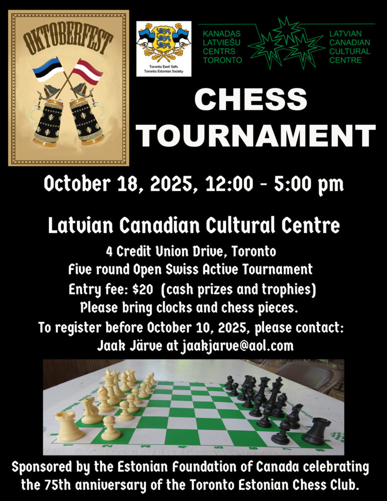 Also on Saturday, October 18th, starting at 12 noon, an Oktoberfest Open 5 round Swiss Active Chess Tournament will be held at the lower level, sponsored by the Estonian Foundation of Canada in celebration of the 75th Anniversary of the Toronto Estonian Chess Club. Entry fee is $20.00 with cash prizes and trophies for the three top finishers. Top Junior (under 16 years of age) will also win $100. To register for this tournament please contact Jaak Jarve at jaakjarve@aol.com to receive your registration form before October 10th, 2025.